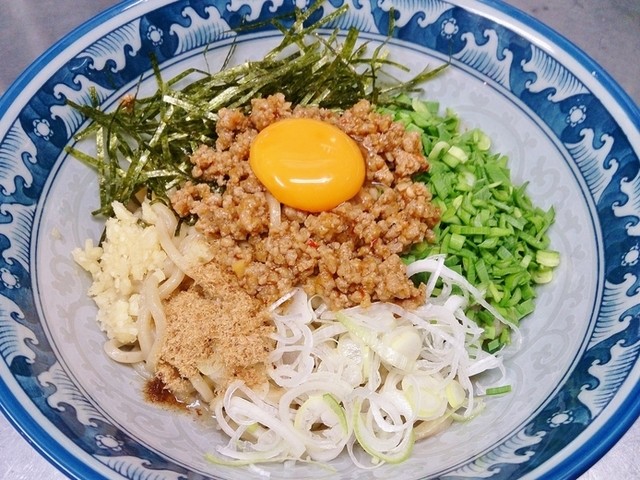 肉みそ、刻みニラ、ネギ、海苔、魚粉、ニンニク、卵黄が
