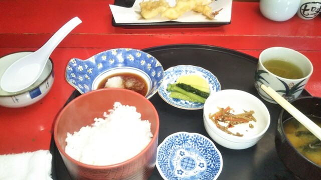天ぷらは海老2匹、キス、茄子、青唐、茗荷(サービス)、かき揚げ。