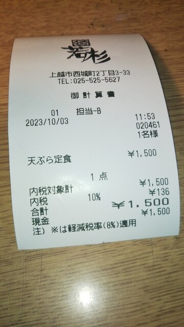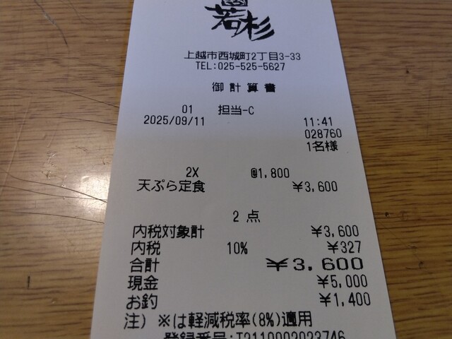カウンターで至極の揚げたての天ぷらを食べる幸せ、レシートの人数が異なるのは何故でしょう。揚げたての天ぷらを食べる為写真無し。