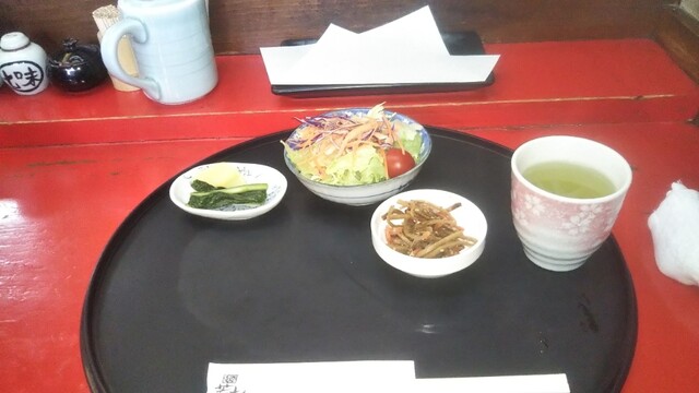 サラダ、小鉢にきんぴらごぼう、赤だし、漬物が付ます。