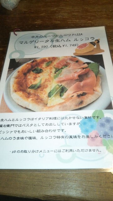 マルゲリータと生ハムとルッコラのハーフピッツァ。