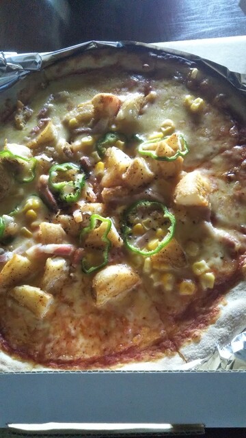 トマトソース、モッツァレラチーズ、ベーコン、ジャガイモ、ピーマン、とうもろこし。