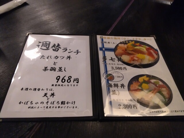 お昼は週替わりランチ、海鮮丼、豪華海鮮丼の多七丼や刺身定食、メギスフライ定食、する天定食、する天ざる蕎麦、三元豚のとんかつ定食等あります(えびふらい定食、あじふらい定食はありません )。