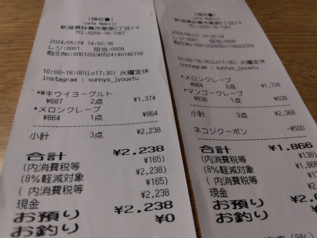 cafe nekogiラスト投稿はティラミスクレープ。(これからも来店します。)と2月来店時のガトーショコラクレープ。