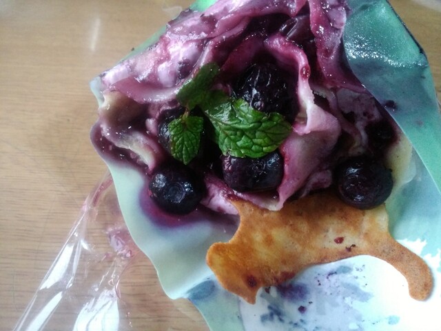 クレープはチョコクレープ、ブルーベリークレープ、カスタードクレープ、あずきクレープ、ティラミスクレープ、カフェモカクレープ等があります。