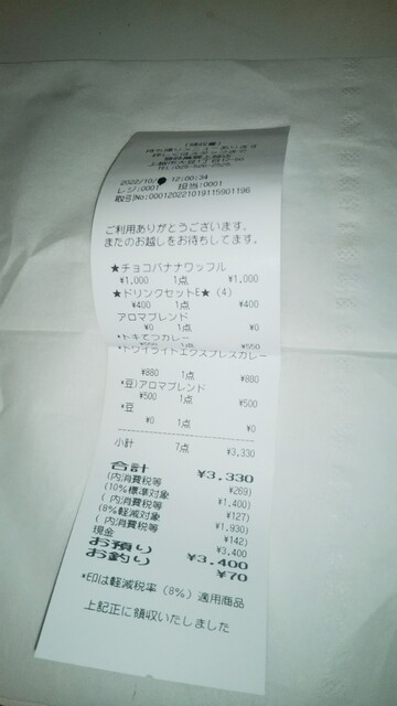 アロマブレンドの豆100グラム、ときめきカレー、トワイライトエクスプレスカレーのレトルトを持ち帰りました。