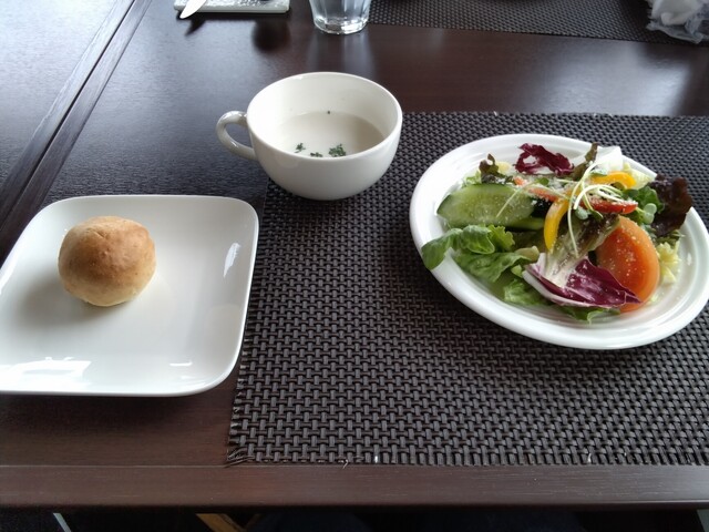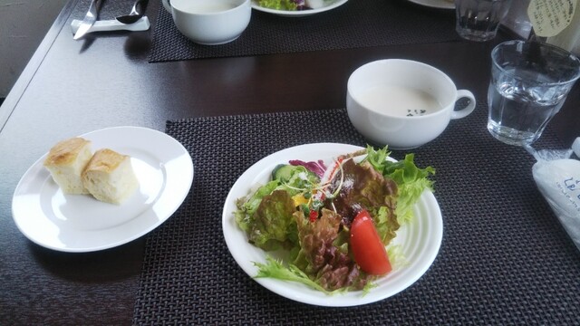 サラダ、白菜のポタージュ、フォカッチャ、水。
