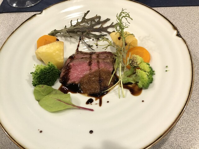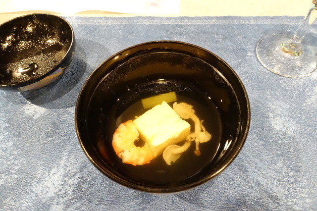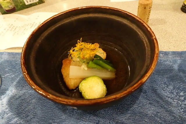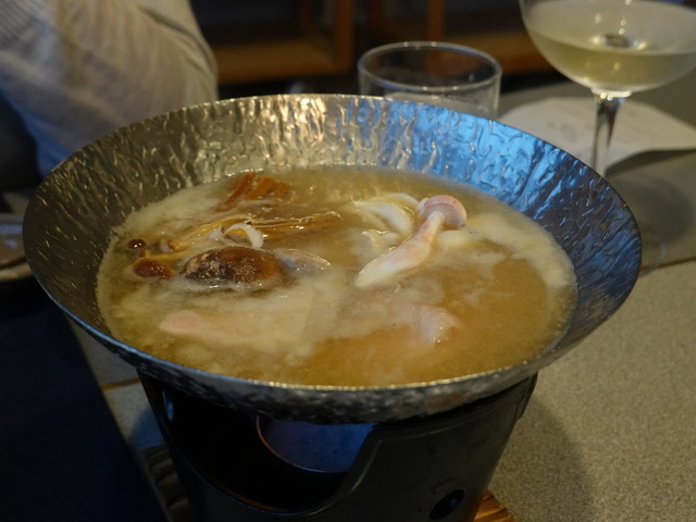 この日のメインは、タコ、鴨などのしゃぶしゃぶ、そして牛肉ソテー。先付からしゃぶしゃぶまでを甲州の白とともに楽しんで、コースの終わりころには、かなり満腹。
