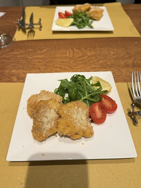 前回は豚肉でしたが、今回、真打の仔牛肉。あまり叩いて平にしていないので、とってもニクニクしく、肉の旨みがよくわかります。結構叩いて薄くするところが多いような気がしますが、このくらいが丁度いいかも。二人に取り分けて、この量。大満足。衣がしつこくないのが良いです