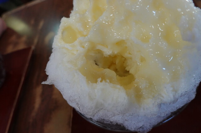 練乳の温度が高い?のか、写真の通り、かき氷が穴だらけで、横から見るとまるで、妙義山!