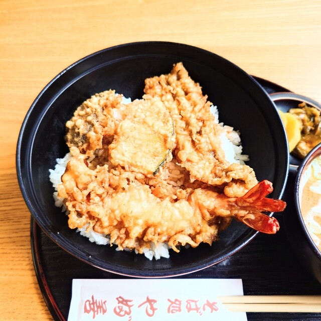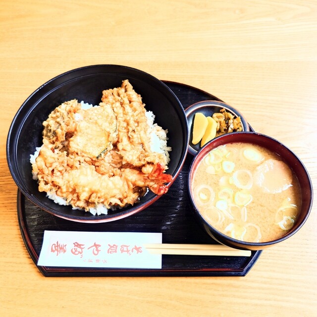 半月盆の上には、メインの"丼"、"味噌汁"のお椀、箸休めの"お漬物"二種盛り、ロゴ入り箸袋に入った"割り箸"が乗っています。