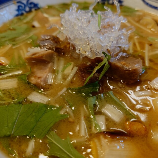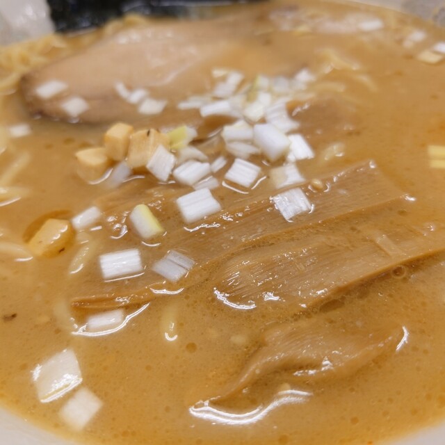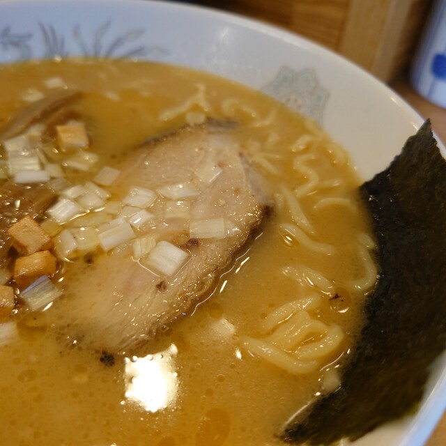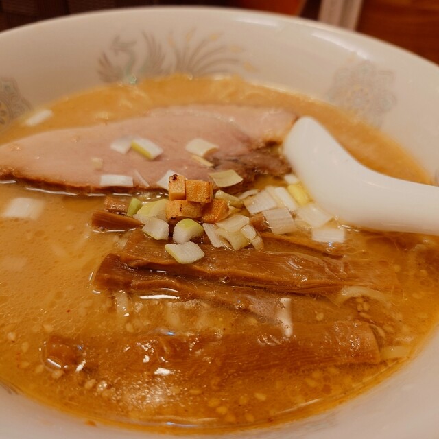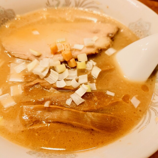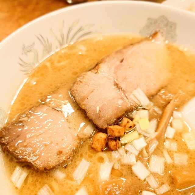 厚切りのホロホロチャーシューが2枚、メンマ、葱、クルトンが乗っています。