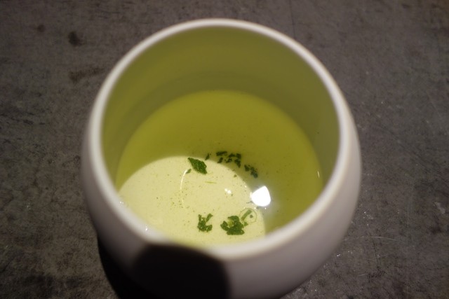 「旬」。ヨモギのチップスが立体的に構築され、ヨモギのペーストとアイス(失念)を乗せながら頂きます。ああ、この饗宴も終わりに近づいているのかと、寂しい気持ちがこみ上げる。