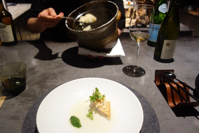 ところで、他のテーブルはエビを躍動的に盛り付けた皿を楽しんでおり、嫉妬心に駆られて思わずスタッフに、どうして甘鯛とエビの人がいるの?と尋ねてしまう。「何度かご来店されて、料理が重複しないように」との説明でした。ぐぬぬ、これはまた来ないと。