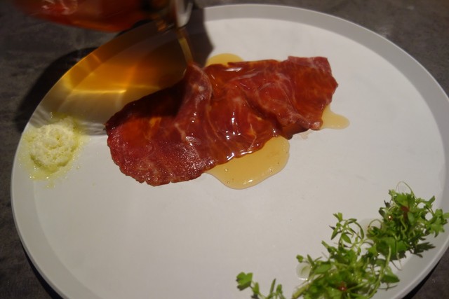 「サスティナビリティー」。子供を産みまくった十数歳のおばあさん牛のカルパッチョです。赴き深い熟成感。フォンを主体にした熱々のスープを流し込み、高尚なしゃぶしゃぶのようにして頂きます。リンゴのソルベも意外性があっていい。