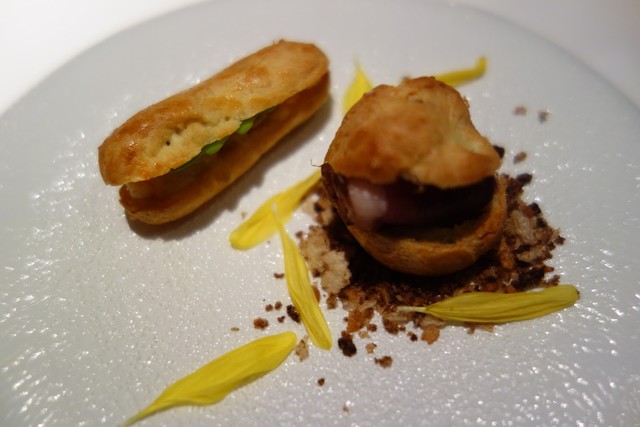 アミューズ。左のエクレアはサーモンのリエット。右のシューは鴨胸肉の燻製です。サーモンは穏やかな塩気と豊かな海の香りに食欲が掻き立てられます。他方、鴨肉は大地を感じられる力強さであげぽよ。飾りつけのお花もいいですよね。アミューズだからといって手抜きは一切ナシ。