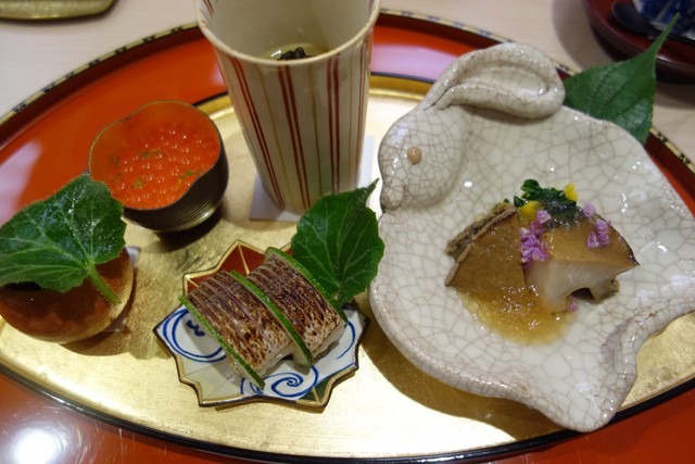萩のアマダイに禁断のウニイクラ。これもちょっと危険球。やりすぎです。この奇観を面前にして、龍吟での食事を思い出しました。それでも外人には大ウケしそうな一皿です。