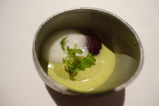 デザートに入ります。巨峰にハーブ(?)のアイスを添え、シャンパーニュの泡で全体を整えます。クレソンのような苦味が感じられ、口腔内をリセットするにちょうど良い役者でした。