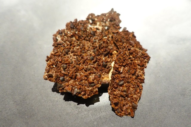 マックヴァン・ド・ジュラ。トロリとした質感でワインそのものとしては美味しいのですが、はやり主張の強い液体でもあり、ほうじ茶アイスのような繊細な味覚に合うかというと疑問。〆のデザート。カカオニブの板を脇によけると、