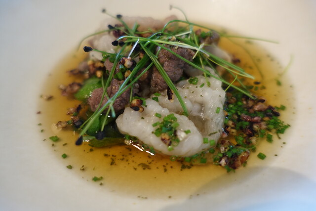 ソースはルイユ(ブイヤベースに用いるニンニク風味のやつ)になっているのも心憎い。これは肉か?と訝しげに説明を求めると、なんとシェフが釣ってきたクロマグロとのこと。え?マグロって人間が釣れるの?わけわかんない。その大トロの部分をマリネして、ああ、どうしたことでしょう、これが信じられないくらい美味しいのです。ちなみに当該マグロはイワシを捕食している最中であり、せっかくなのでソースはイワシを用いたものとのこと。どんなせっかくやねん。