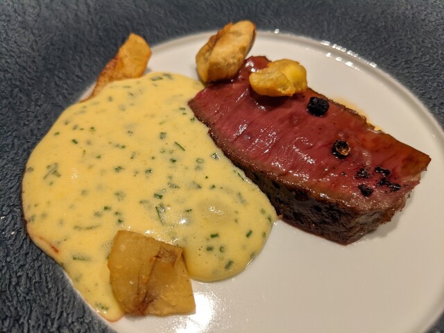 半分食べ進んだ際にドボンとソースベアルネーズをぶち込みます。フランス料理の魂とも言うべき味わいであり絶品。ここのところ何でもかんでも素材素材と言い唐突に生産者に感謝し始める素材原理主義者が増えてきましたが、畢竟、フランス料理とはソースなのである。