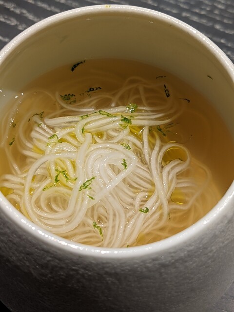 天理の葛そうめん。葛のツルツルとした喉越しとコシのある歯ごたえが妙味であり、さりげなく旨味の強いスッポンとオリーブオイルのスープに良く合います。