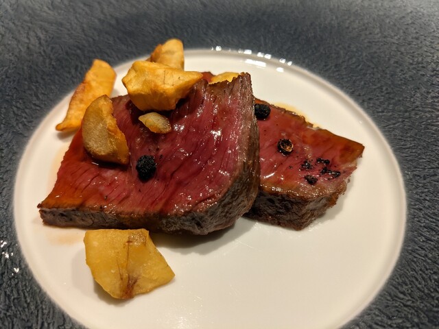 メインは都萬牛(とまんぎゅう)のランプ肉。宮崎県が誇るブランド牛であり、黒毛和牛でありながら赤身主体という面白い試みです。ゲスト8人に対してシェフが付きっ切りで調理するので火入れはもちろんパーフェクト。霜降りは控えめで、赤身の旨味とミネラルを強く感じます。