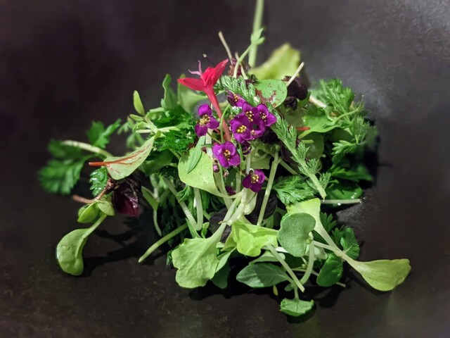 サラダは香り高いハーブが百花繚乱。葉っぱによって風味が異なり、ひと口ごとに味覚が移り変わります。仄かな苦みが食欲を刺激する。