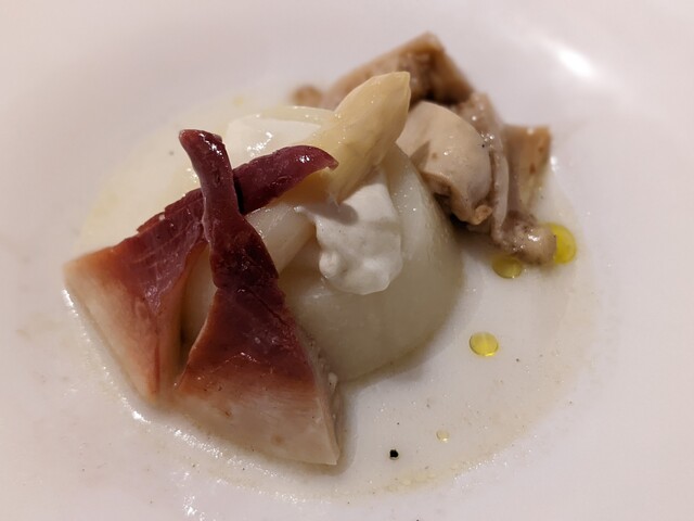 ワインは全てボトルで注文しました。ワインリストは無くホールスタッフと相談しながら決めていくのですが、自信なさげにブツブツとつぶやくスタイルで何言ってるか全然聞き取れない。先のうるさいゲストの存在と相俟ってコミュニケーションを取るのに難儀しました。また、ちょろい客と思われたのか途中から謎に高いワインばかり提案されるようになり心が折れました。今夜は色々とついていないのかもしれません。