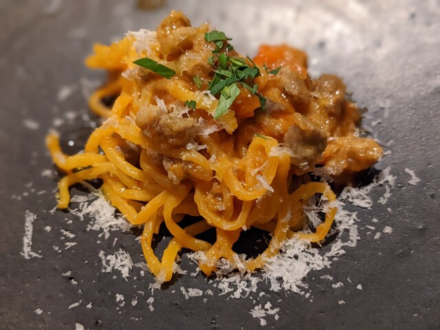 続くパスタはタヤリン。卵黄をたっぷり用いるパスタであり、モッチリとしながらも歯切れの良い独特の食感が心地よい。蝦夷鹿のラグーといった力強いソースに負けない濃厚な風味が堪りません。アクセントに山椒を組み込んでおり、その鮮烈な香りとピリリとした心地よい刺激が後味に軽やかさとキレをもたらします。センスいいなあ。
