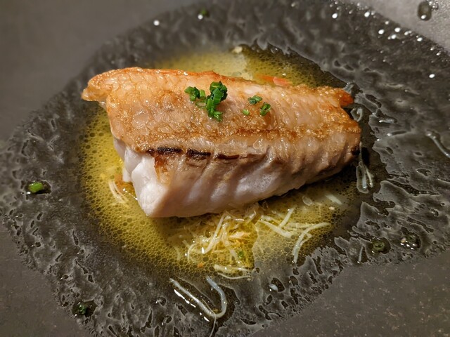 キンメダイ。お魚そのものの美味しさは当然として、鯛のアラや骨から丁寧に取られた黄金色のスープが絶品。魚介の滋味という滋味がすべて溶け込んだスープがキンメダイ自身の味わいを何倍にも増幅させます。