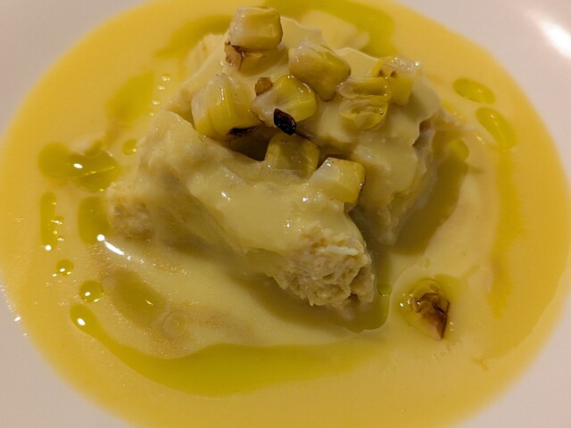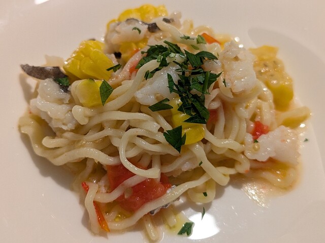 パスタ1品目はハモとトウモロコシ。日本料理店の〆のお食事のような組み合わせであり、鰻と同様にハモ料理のフロンティアを開拓するひと皿です。