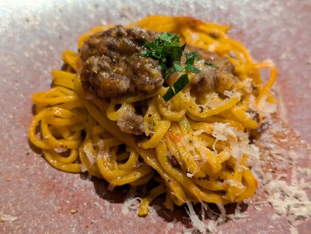 お肉のパスタも出ます。ミルキーでセクシーなフレーバーがインプレッシブで、それはつまり日本語に訳すと快哉を叫びたくなるほどの美味しさでした。何なん魚介料理が得意とか言って肉もパスタまで旨いとかチートじゃね?