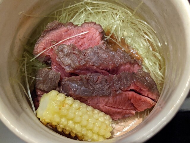 ウミゾウメン。初めてお目にかかる食材ですが、周りにジュンサイ的ぬるぬるを纏ったモズクのような海藻です。お出汁はエン貝という、これまた初めてお目にかかる食材から取っており、ヨーロッパのムール貝的なタフな味わいです。