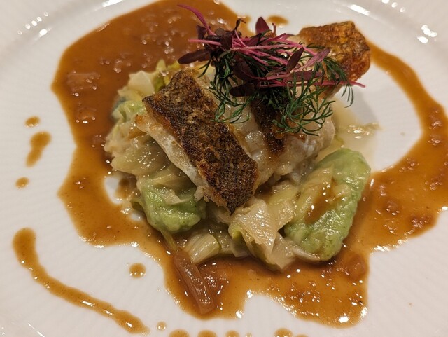 キジハタは思い切り良く炙っており、そのザクザクとした歯触りにテンションは爆上がりです。春菊を練り込んだニョッキにオマールの風味が効いたソースと、魚料理として最上級の逸品です。