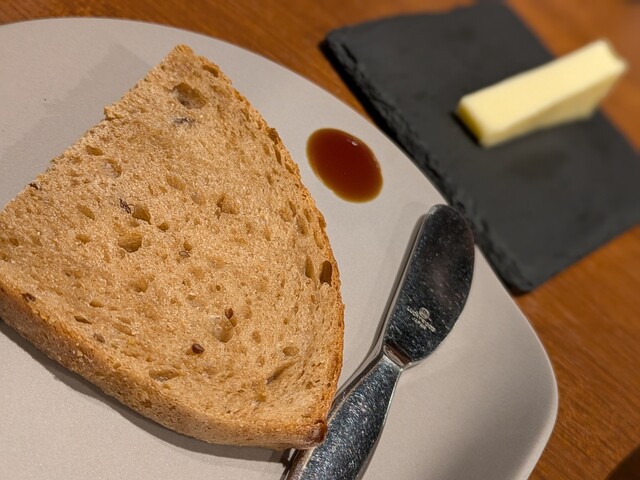 パンも自家製で、この日はレーズンの酵母を用いたもの。ミチっとした密度があり、発酵バターと合わせて食べるだけでとっても万歳。もちろん料理のソースを1滴も逃すまいと、スパチュラ代わりにも活用できます。