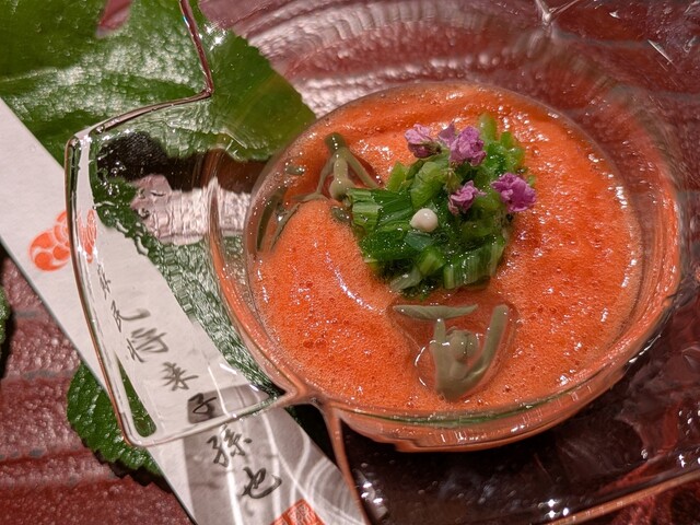 まずはすり流し。「深層水トマト」という海洋深層水を与えることで水の吸収を抑えて栽培し糖度を上げたフルーツトマトを用いており、凝縮された甘みと旨味、そして爽やかな酸味が見事に調和します。つるりとした喉ごしのじゅんさいも添えられており、食感に楽しいリズムと清涼感をプラスします。
