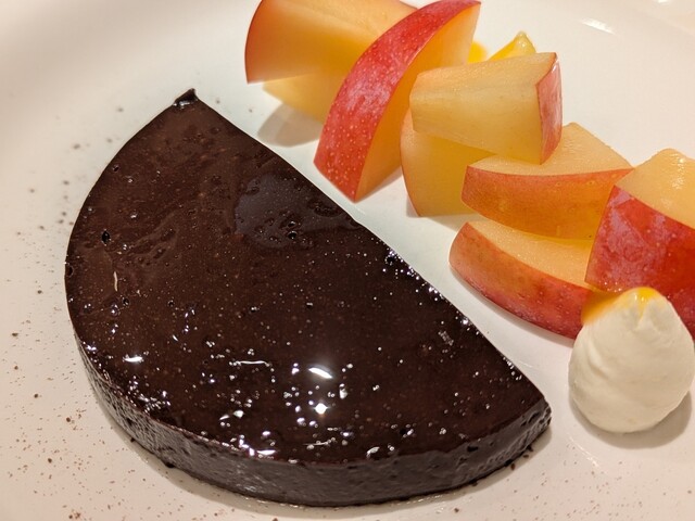 メインのデザートは生チョコレート。ドミニカ共和国サマナ半島産のカカオを用いており、赤い果実を思わせるフルーティーな酸味やスパイシーなニュアンスを感じさせます。口溶けは滑らかで、舌の上でゆっくりと溶けていくにつれカカオ本来の複雑で奥深い風味が花開き、甘さだけでなく心地よい苦味や酸味の余韻が長く続きます。これは史上最強のチョコレートかもしれない。