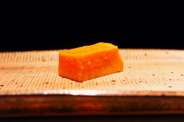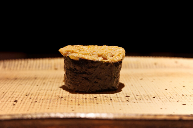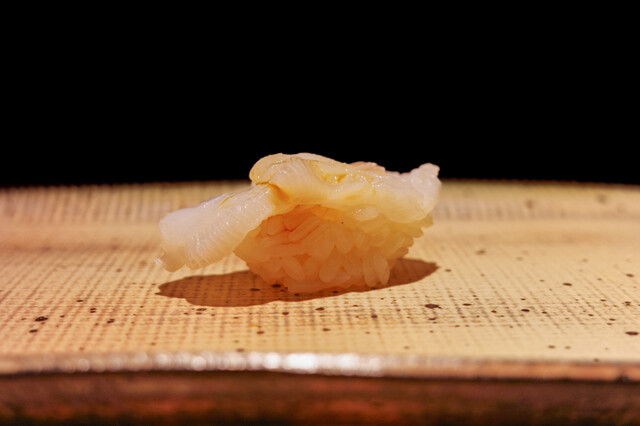 烏賊は薄切り6枚をミルフィーユのように重ねたものが1つの握りとして提供されます。噛んだ時の烏賊の違和感がなく、スッと舎利に溶け込みます。なんと烏賊にある組織構造を計算しながら切り付けているらしい…。