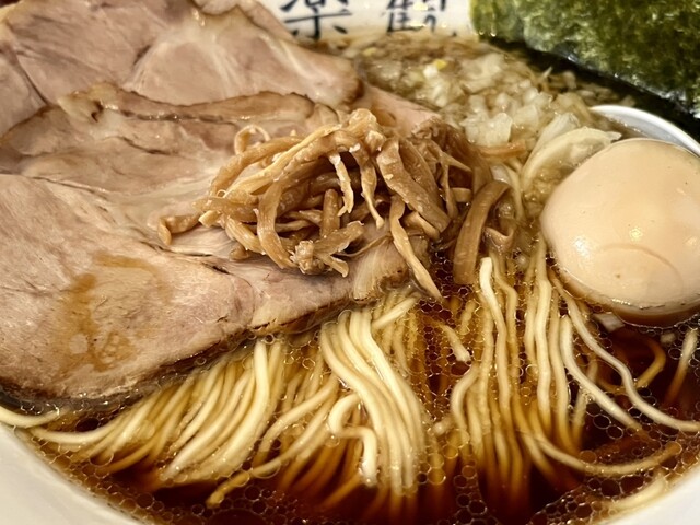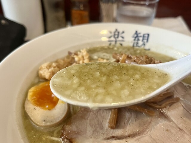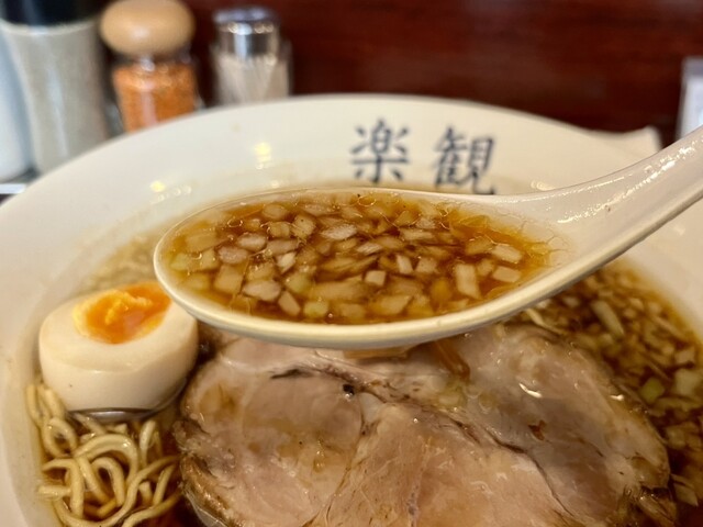 レンゲ1杯分の背脂がよそってあり早速、ずずっと。んー、これはパールでなくてもいいなー。琥珀でも。というか楽観のラーメンには背徳的な美味しさを求めてないの入れないほうが美味しいな!でも知見が増えたのでよし!