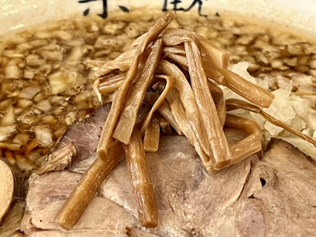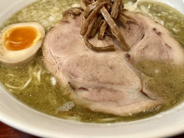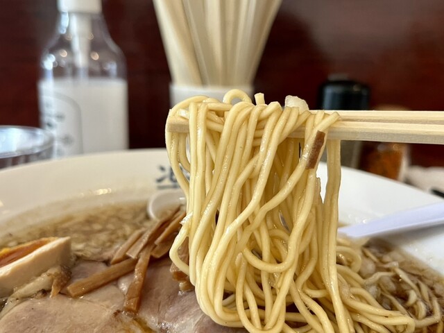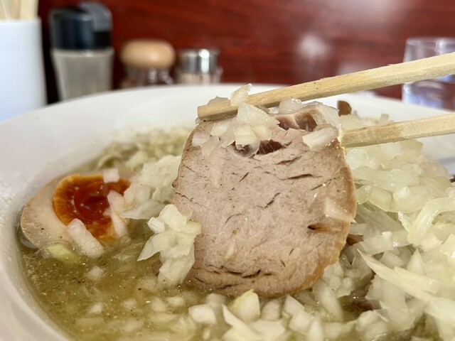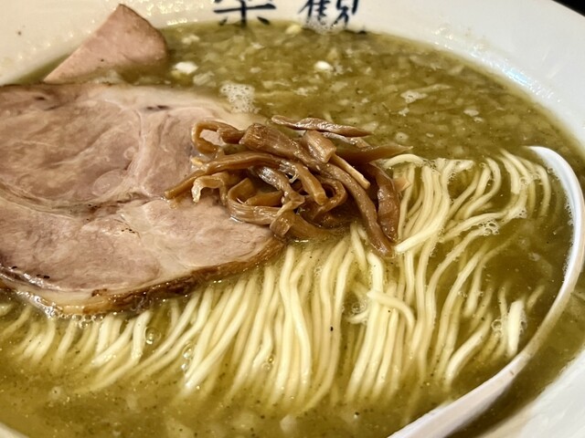 まずはワカメだけで食べてみる。おお、磯の香りが強い。なかなか攻めたワカメです。スープと一緒に啜ると塩味に磯の香りが乗っていつもとは違う味わい!美味しいですね〜。チャーシューと一緒に食べてみるとこれまた磯の香りがアクセントになってこれなかなか。