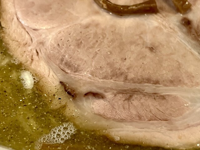 チャーシューが3枚に味玉と海苔が乗ってる。豪華だー。スープをずずっと。ん、んん!今日のスープはいつもと違う。なんかうめぇー!普段より油が控えめ?醤油も普段より薄味で淡麗な鶏ガラの旨さが際立っていました。めちゃくちゃ好みなスープだー!琥珀の中で最高得点かもしれない!完飲!