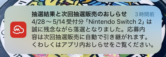 Switch2応募のはなし。今日午後にニンテンドーからメールとプッシュ通知で第2回目のSwitch2抽選落選のお知らせが届きました。悲しみ。国内版マリオカートセットは一番お得だから競争率たかいよなー。
