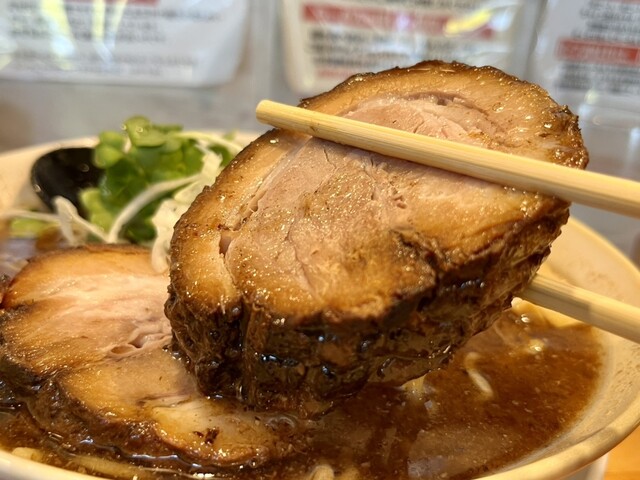 箸で持つと落としそうなほどの重量と分厚さのチャーシュー、そして肉厚だけど味染み。デカくてうめぇ〜!最高〜!幸せ〜!これ何個も食べたい〜、と思うけど食べ終わる頃には腹パン!だから1個で充分!大満足!