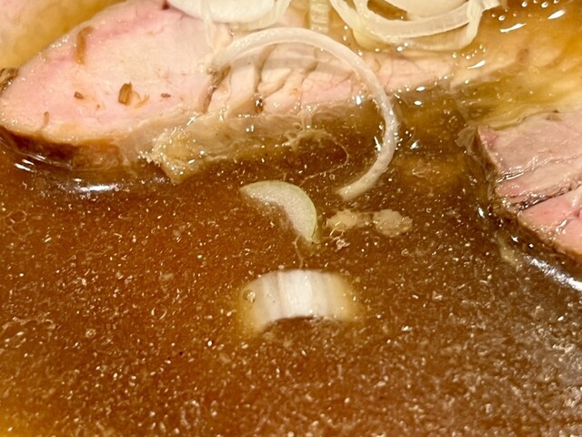 着丼、今日も深みのある醤油色のスープに煮干しの濁り、油膜の反射が美しい。今日も美味そう〜!