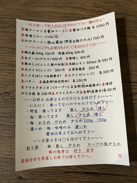 だけど脂身少なめで硬めの豚の方が好きなのはたしか。注文表をよくみると、下に豚の好みの選択肢があるじゃん。今度から脂身は「苦手」にチェック入れるようにしよう。