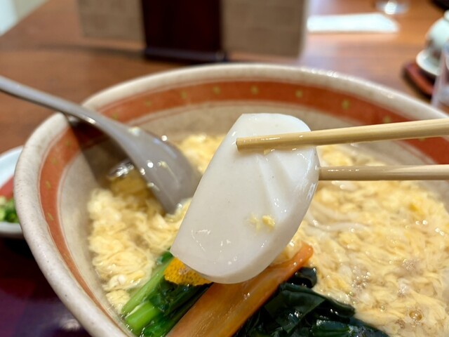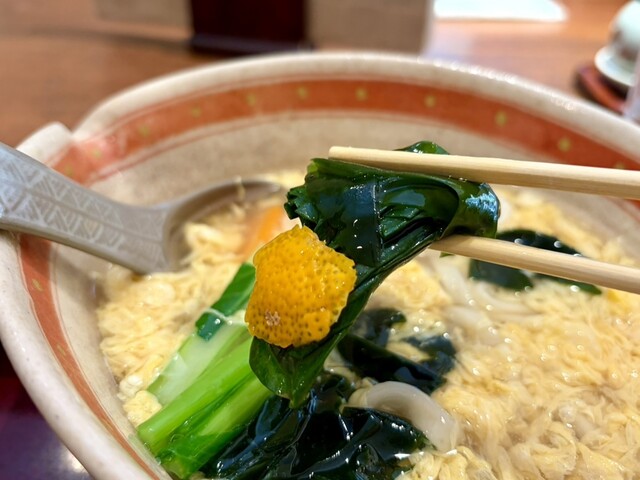 とろとろの卵とじにお汁もとろとろ。ダブルのとろとろに癒される〜。卵とじの甘さにいりこ出汁も良き。蒲鉾は厚切りで素材の良さがわかる美味しさ。みかんの皮はお口が爽やかになる香り。アクセントになって良かった。とても寒い日でしたがホカホカになりました。