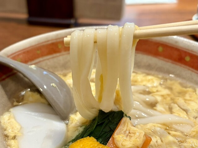 卵とじをかき分けてうどんリフトしてみると思いの外細い。店名から讃岐うどん=太麺のお店なのかと思っていたけど平打ち細麺。自分が想像する讃岐うどんのビジュアルとは違っていたけど細麺の方が好みなのでむしろ良し。