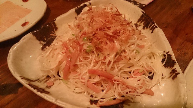 鰹の山椒煮、水茄子の浅漬け、揚げ豚餅、揚げワンタン。
