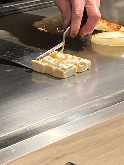メインのステーキも目の前で調理をしてくれ、調理中にはもうどきどきとワクワクが止まらず常に笑顔が溢れます、サシが綺麗に入ったお肉は素敵なお肉なのが素人の私でも一目瞭然、付け合わせの豆腐のタルタルソースがと焦醤油が一段とお肉の美味しさを加速してくれます
